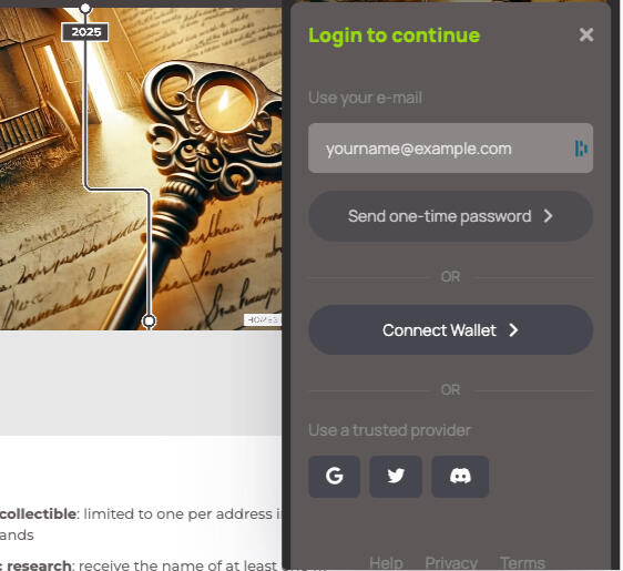 🆔 Log In: In the email, you'll find a link to your unique collectible. Click it to log in using your email address, or with a Google, X (Twitter), or Discord account. You can log in via the module on this website (bottom right) or directly through your mobile browser.